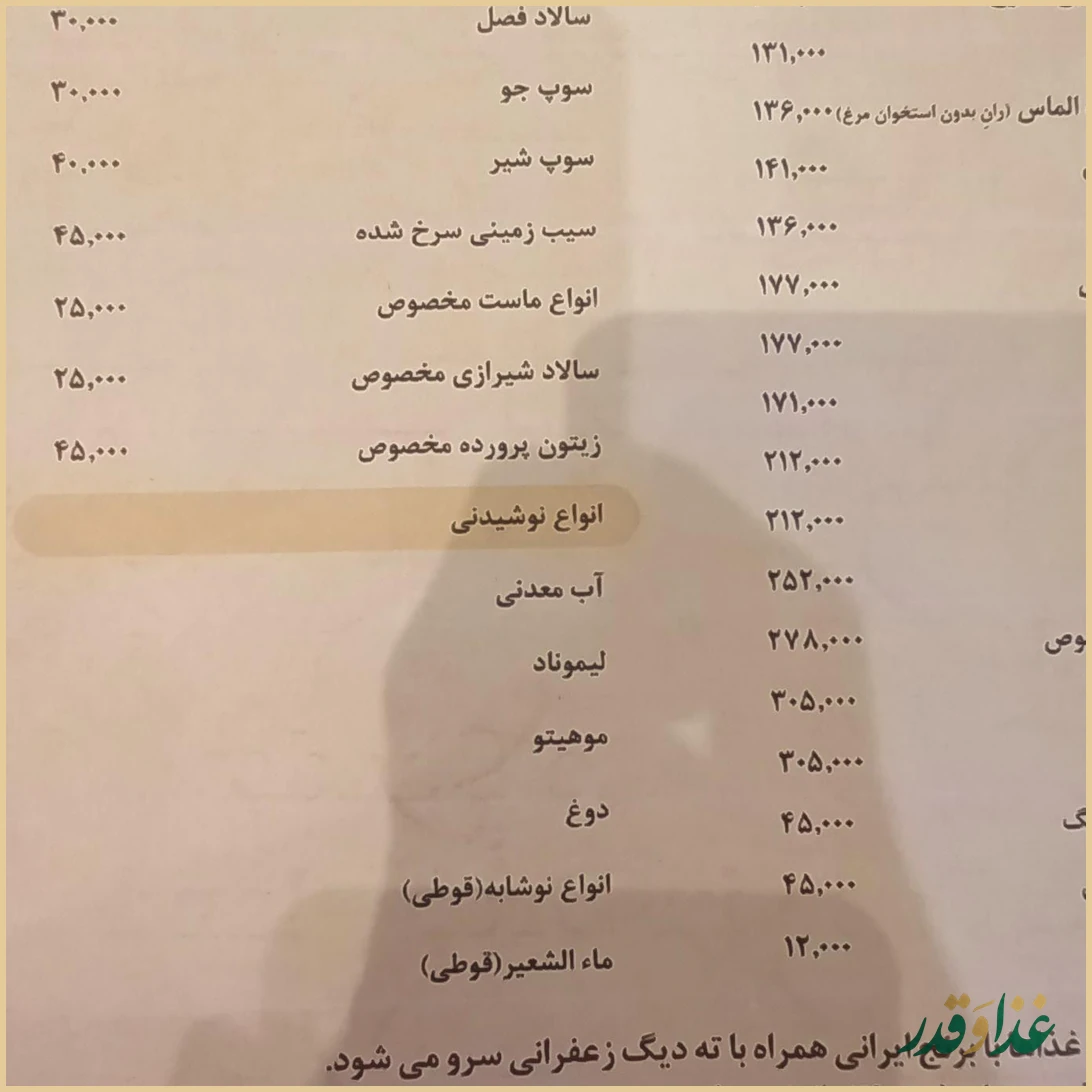 طبق نظر مشتری، سوپ، نوشابه و حتی نان بهصورت جداگانه محاسبه میشوند و روی قیمت اصلی غذا نیستند؛ بنابراین هنگام سفارش، حتماً درباره هزینه اقلام جانبی سؤال کنید تا در پایان غافلگیر نشوید.