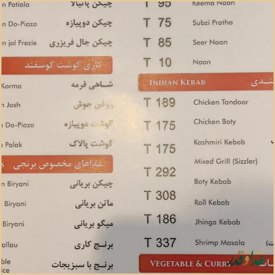 بله، منوی رستوران شامل انواع غذاهای هندی است و کسانی که امتحان کردهاند، تجربهشان را خوب و متفاوت توصیف کردهاند؛ اگر به طعمهای ادویهدار و خاص علاقه دارید، بخش هندی منو میتواند برایتان جذاب باشد.