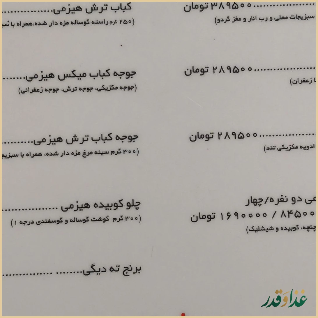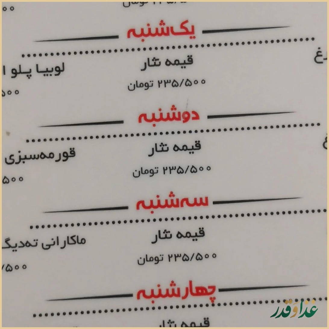این رستوران در دسته رستوران ایرانی و تا حدی شمالی قرار میگیرد و سینیهای کباب و پکهای ویژه مثل پک یلدا از مواردی هستند که برخی مهمانان از آنها رضایت بیشتری داشتهاند. در مقابل، چندین نظر درباره استیک، تهدیگ گوشت بادمجان، قورمهسبزی، چنجه و ماکارونی حاکی از نارضایتی بوده است؛ بنابراین اگر برای اولین بار مراجعه میکنید، انتخاب سینی کباب و برنجی که مهمانان از آن تعریف کردهاند، انتخاب محافظهکارانهتری خواهد بود.