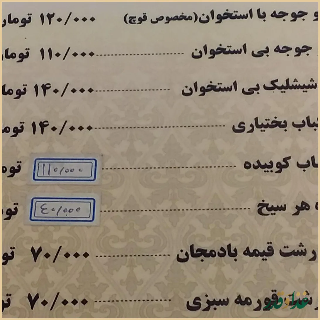 طبق یکی از نظرات، در فروردین ۱۴۰۴ اکثر غذاها حدود ۳۰۰ هزار تومان و ماهی قزلآلا ۳۵۰ هزار تومان بوده است. با توجه به حجم بالا و مقدار گوشت در خورشتها و دورچین کامل کنار جوجه، بسیاری از مشتریان قیمت را متناسب با کیفیت و حجم میدانند، هرچند دریافت مالیات ارزش افزوده برای برخی خوشایند نیست.