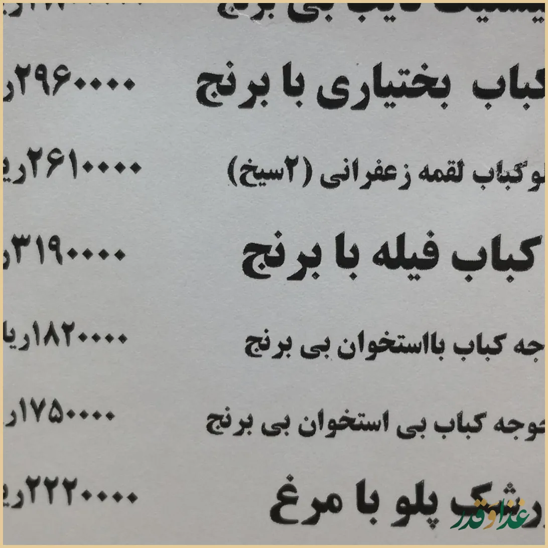 در نظرات کاربران دو دسته تجربه دیده میشود؛ عدهای کیفیت کبابها، بهخصوص کباب برگ را «بسیار عالی» و «طعم واقعی کباب» توصیف کردهاند، اما گروهی دیگر از طعم نامطلوب بعضی kebabها، خشک بودن برنج و کباب و حتی ناپختگی جوجه گلایه کردهاند. بنابراین کیفیت غذا برای همه مراجعان یکسان نبوده و بهتر است با انتظار متوسط رو به بالا، اما نه بینقص، به رستوران بروید.