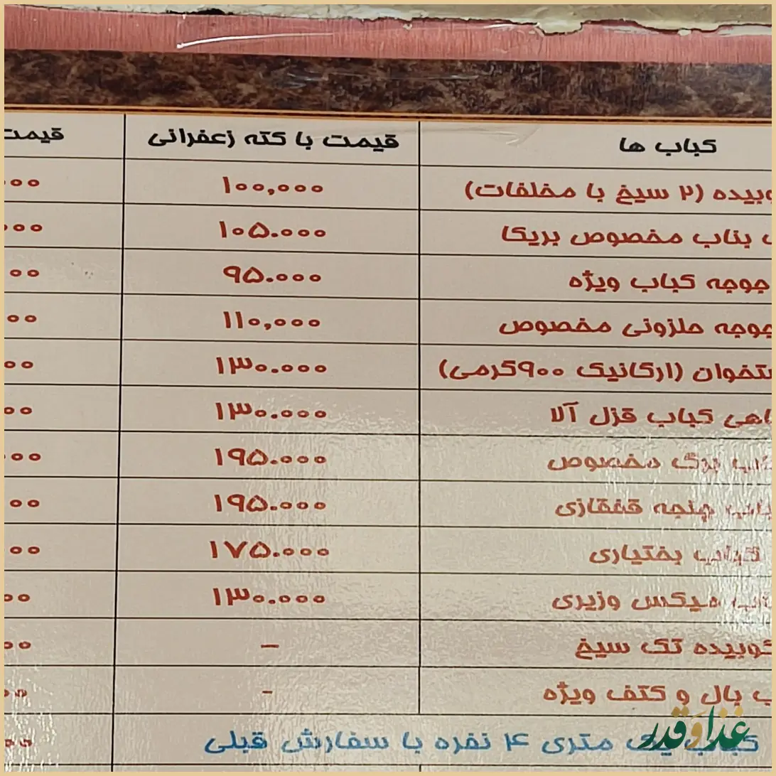 بعضی از مشتریان قیمتها را مناسب و قابل قبول نسبت به کیفیت توصیف کردهاند، اما در چند نظر دیگر از «قیمت بسیار بالا» گلایه شده است؛ به نظر میرسد میزان رضایت از قیمت تا حدی به نوع غذایی که انتخاب میکنید بستگی دارد، بنابراین خوب است قبل از سفارش، منو و قیمتها را با دقت بررسی کنید.