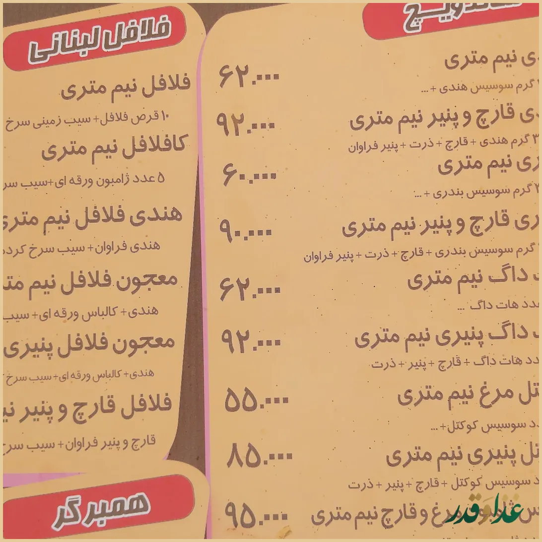 محبوبترین آیتم منوی ساندویچ نیم متری فلاتک سپاهان چیست؟