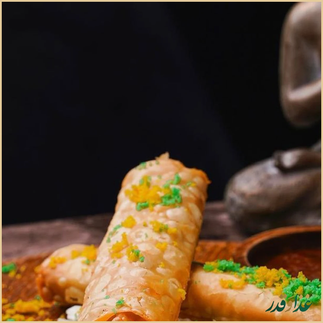 ۲ تکه پیراشکی رول شده با خمیر دست¬ساز ژاپنی، برنج ژاپنی، سبزیجات، زنجبیل، سس مخصوص، کنجد، روغن کنجد