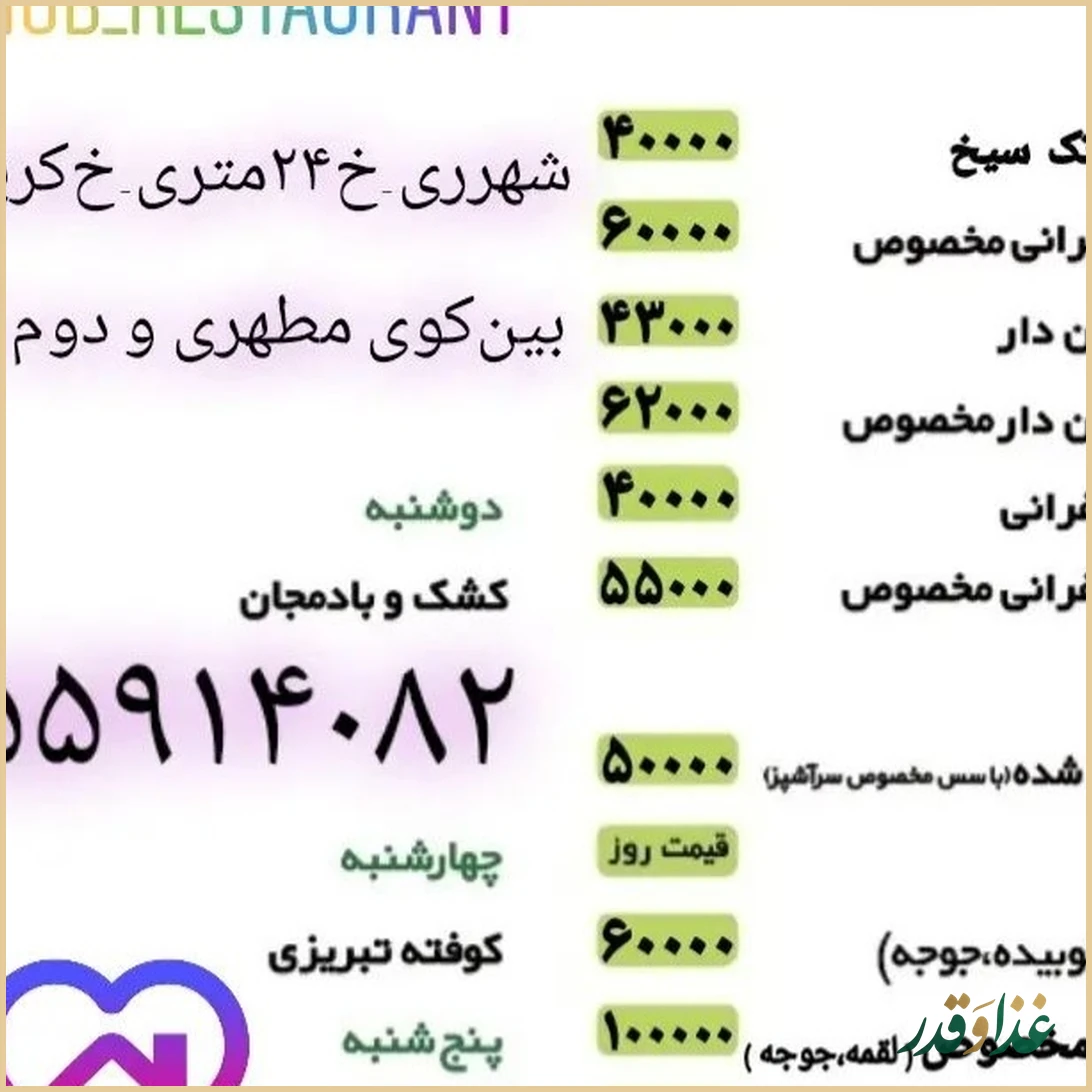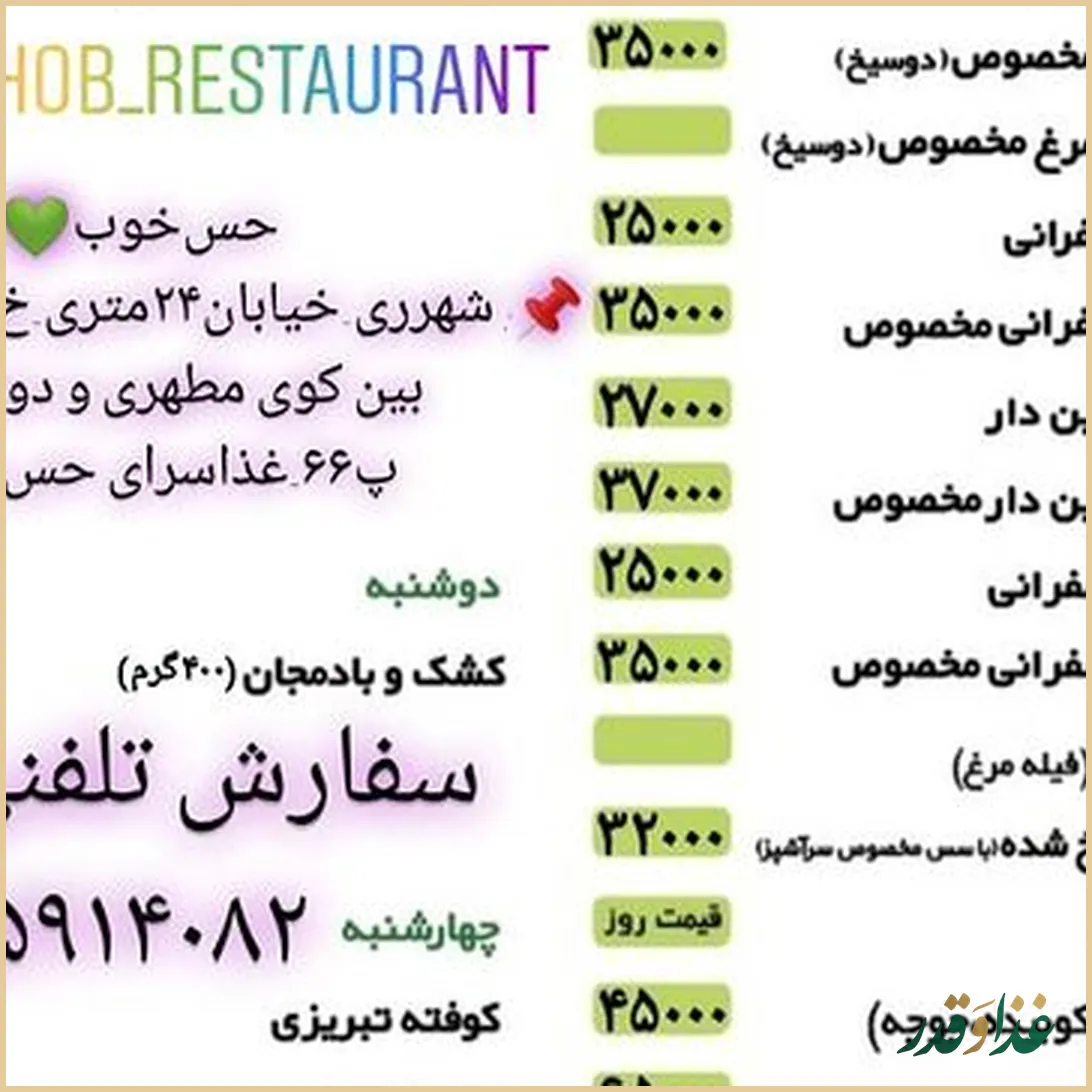 غذاسرای حسخوب یک رستوران ایرانی دنج و خانوادگی در محله اقدسیه است که با وجود ظاهر ساده و نقلی، بسیاری از مشتریان ثابت خود را با طعم منحصربهفرد و خانگی غذاهایش شگفتزده کرده است. فضای اینجا بزرگ و پرزرقوبرق نیست، اما تمیزی محیط، برخورد مؤدب و حرفهای پرسنل و سرویسدهی خوب، حس صمیمیت و آرامش دلنشینی ایجاد میکند. بیشتر مهمانها از کیفیت بالای کبابها، چلو جوجه، زرشک پلو با مرغ و بهطور کلی طعم «غذای خونگی» تعریف کردهاند. قیمتها نسبت به کیفیت، منصفانه توصیف شده و امکان سفارش با پیک نیز برای کسانی که ترجیح میدهند در خانه غذا میل کنند، وجود دارد. اگر بهدنبال یک غذاسرای جمعوجور اما خوشسلیقه و باکیفیت در جنوب شهر هستید، حسخوب میتواند انتخاب مناسبی باشد.