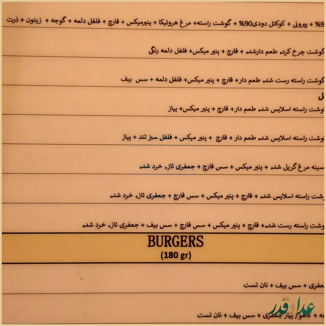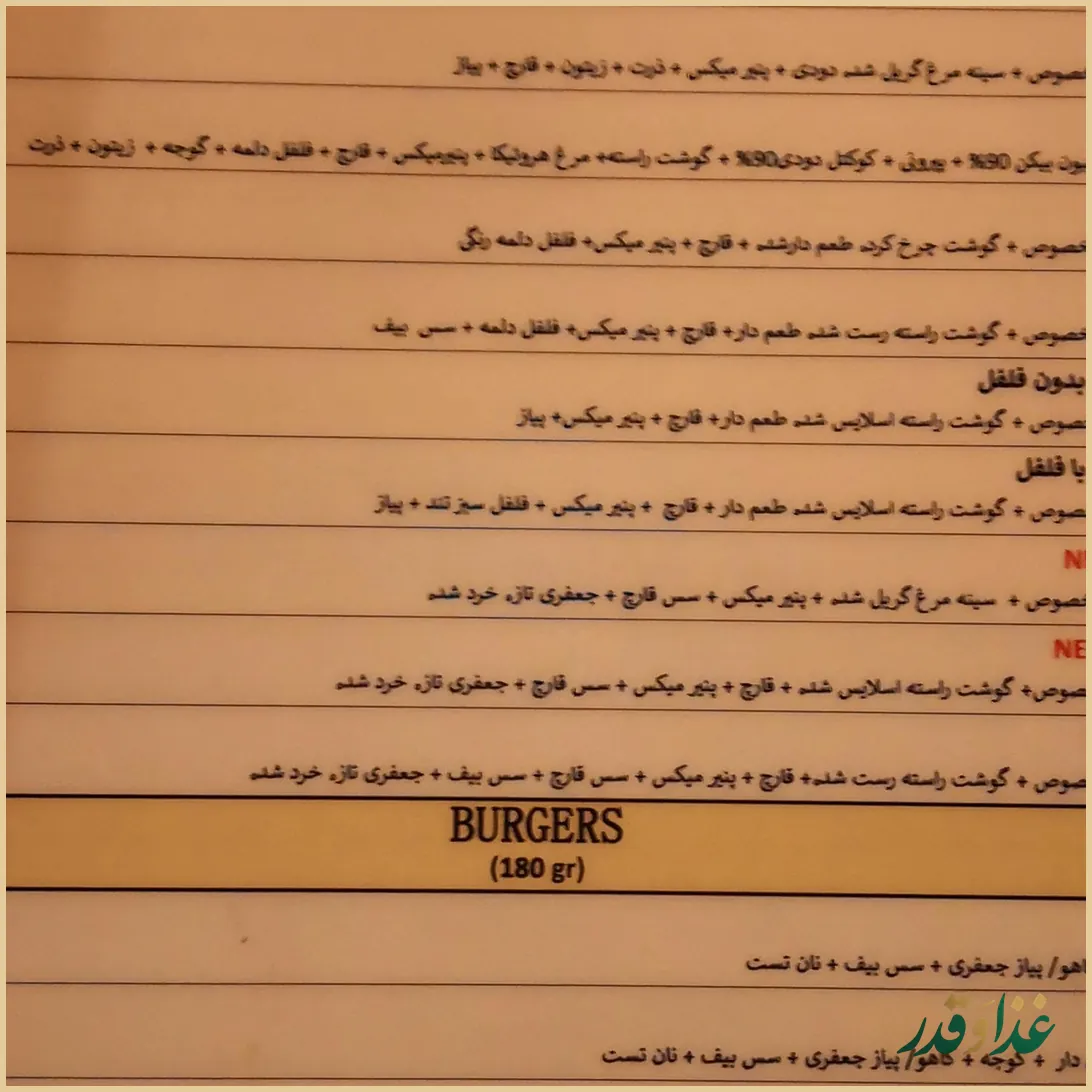 برخی مشتریها از کیفیت استیک مرغ، پنه آلفردو، هاتداگ و سالاد سزار رضایت خوبی داشتهاند و این موارد را پیشنهاد کردهاند. در عین حال، یک نظر منفی جدی درباره مسمومیت بعد از خوردن سالاد سزار ثبت شده که لازم است رستوران روی کنترل کیفیت و بهداشت مواد اولیه، مخصوصاً سالادها، حساسیت بیشتری داشته باشد.