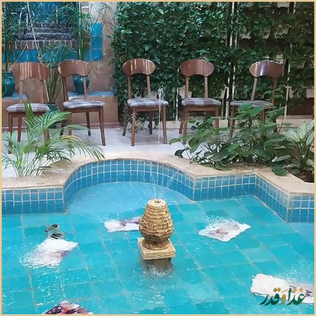 فضا بسیار آرام، پرآرامش و با صدای شرشر آب توصیف شده و وجود حوض در وسط سالن، با اینکه حیاط مجزا ندارد، حالوهوای خاص و زیبایی به محیط داده است.