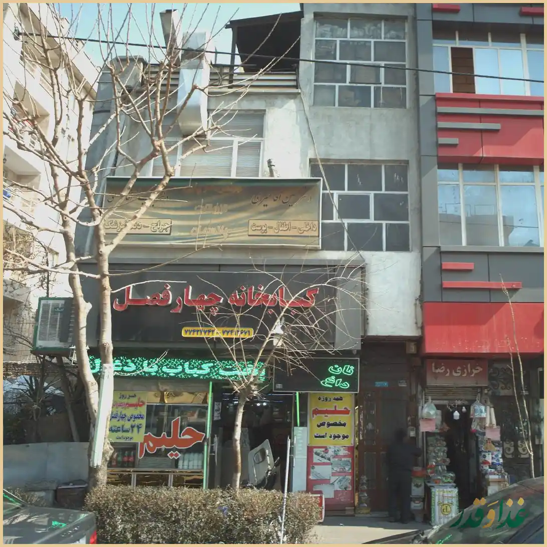 کبابخانه چهار فصل در محله حافظیه تهران و در خیابان سیمتری نیروی هوایی قرار دارد و بین اهالی شرق تهران بیشتر بهخاطر کبابهایش شناخته میشود. کاربران بهویژه از حلیم معجون اینجا خیلی تعریف کردهاند و آن را یکی از بهترینها در منطقه میدانند. ترکیب کبابهای تازه با نان داغ از نکتههایی است که در تجربه مشتریان زیاد تکرار شده و برای یک وعده ناهار یا شام ساده و صمیمی گزینه جذابی است. درباره قیمتها نظرها کمی متفاوت است و بعضیها آن را مناسب و بعضی دیگر کمی گران توصیف کردهاند، اما در مجموع برای دوستداران کباب یک انتخاب قابل توجه در شرق تهران به حساب میآید.